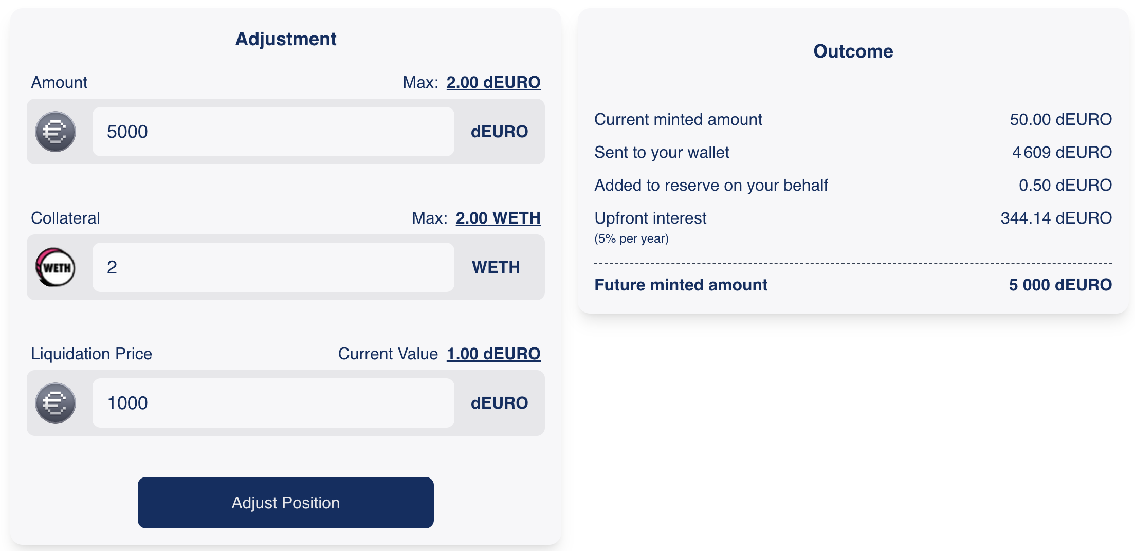 Once you are the proud owner of a position whose cooldown period has passed, you can start to adjust it. You can adjust the outstanding amount, the amount of the deposited collateral, and the liquidation price. Every input field has a magic wand button that automatically sets the value to whatever makes most sense given the other two values.