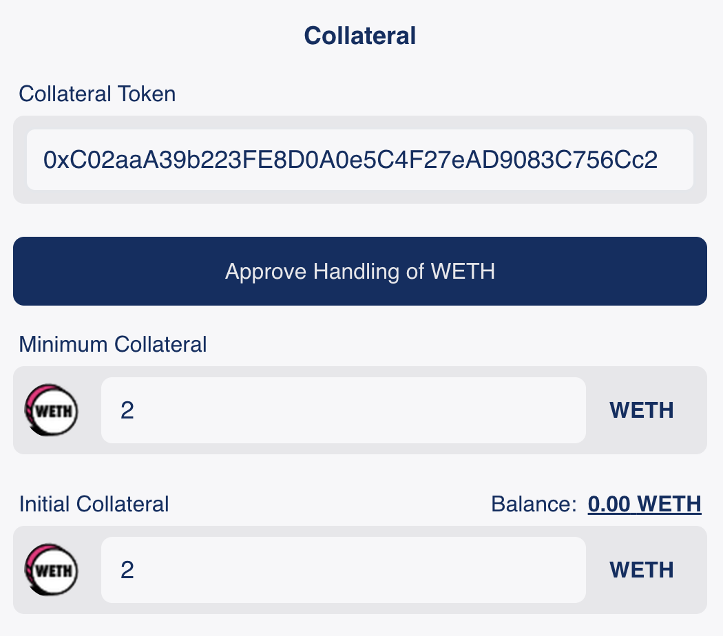 First of all, the collateral token needs to be selected by pasting its contract address into the first field, and approve handling of the token. This can be done for example through MetaMask. The chosen collateral should be freely traded on the market and have a somewhat stable value. For criteria that collateral tokens should fulfil, have a look at the Acceptable Collateral (opens new window) page. The minimum collateral section is the minimum acceptable amount of collateral and should be set to about 5 000 Decentralized Euro worth of collateral (in this specific case 2 WETH were chosen). It is not possible to decrease the collateral in a position below the minimum without closing it entirely.