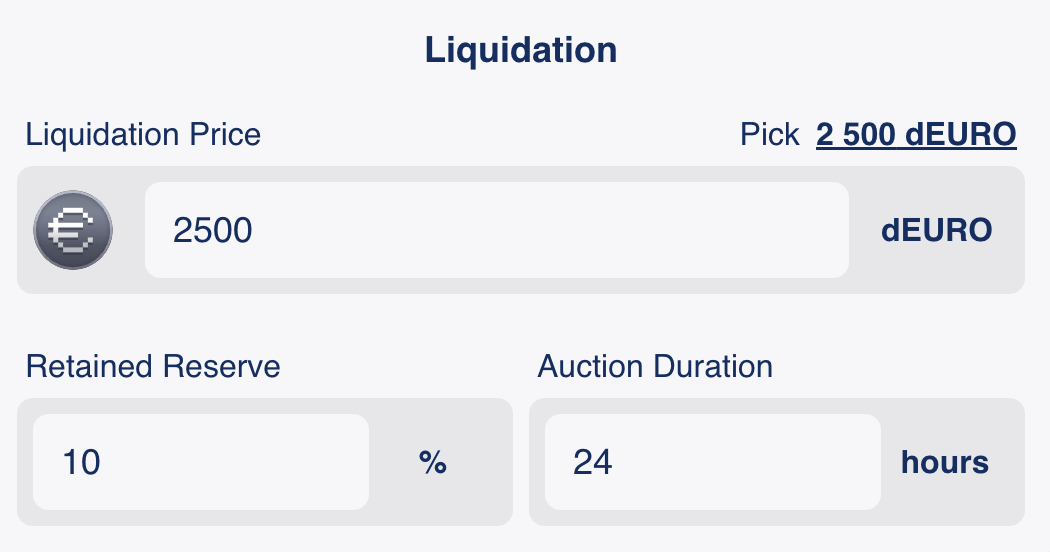 The liquidation price can be set freely but must result in a position liquidation of at least 5 000 Decentralized Euro. In the previous box, we've set a minimum collateral of 2 WETH. With a minimum collateral liquidation value of 5 000 Decentralized Euro, the liquidation price for each WETH must thus be at least 2 500 Decentralized Euro, as 2 * 2 500 = 5 000. Had a minimum collateral of 20 WETH been chosen, the minimum liquidation price would thus be (5 000 / 20) 250 Decentralized Euro.